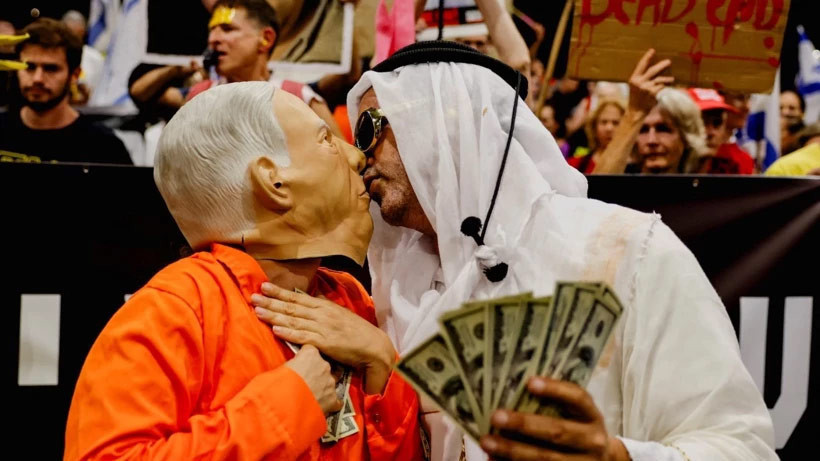 Hapishane tulumları giymiş birkaç göstericinin Gazze Şeridi’nde işlenen savaş suçları ve insanlığa karşı suçlardan dolayı Uluslararası Ceza Mahkemesi’nin (UCM) hakkında tutuklama kararı çıkarttığı Başbakan Netanyahu’nun hapse atılmasını talep eden pankartlar açtığı görüldü.